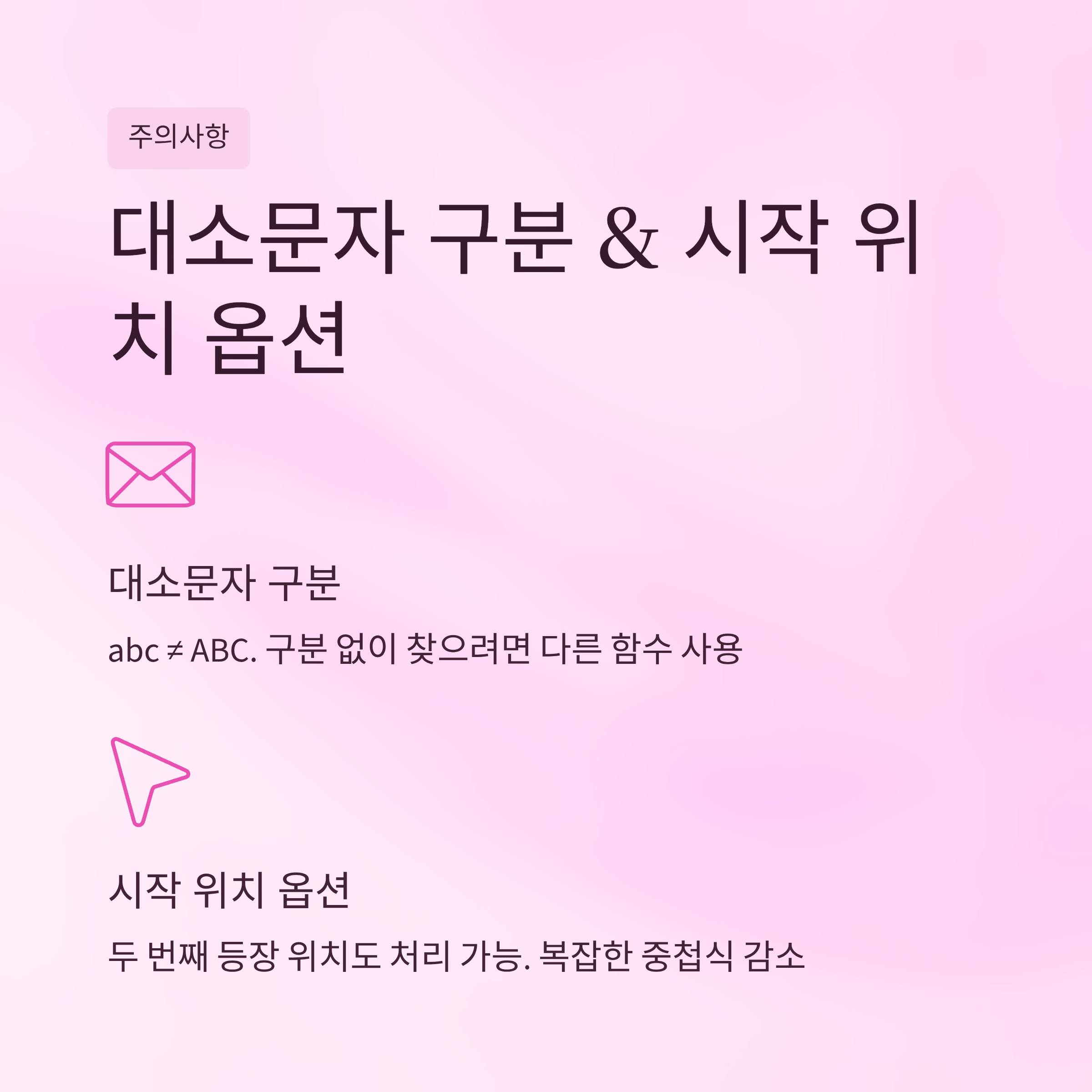 가장 흔한 함정은 대소문자 구분이에요.abc와 ABC를 같은 것으로 보고 찾고 싶다면, 같은 “찾기” 계열이라도 다른 함수를 쓰는 편이 더 맞아요.