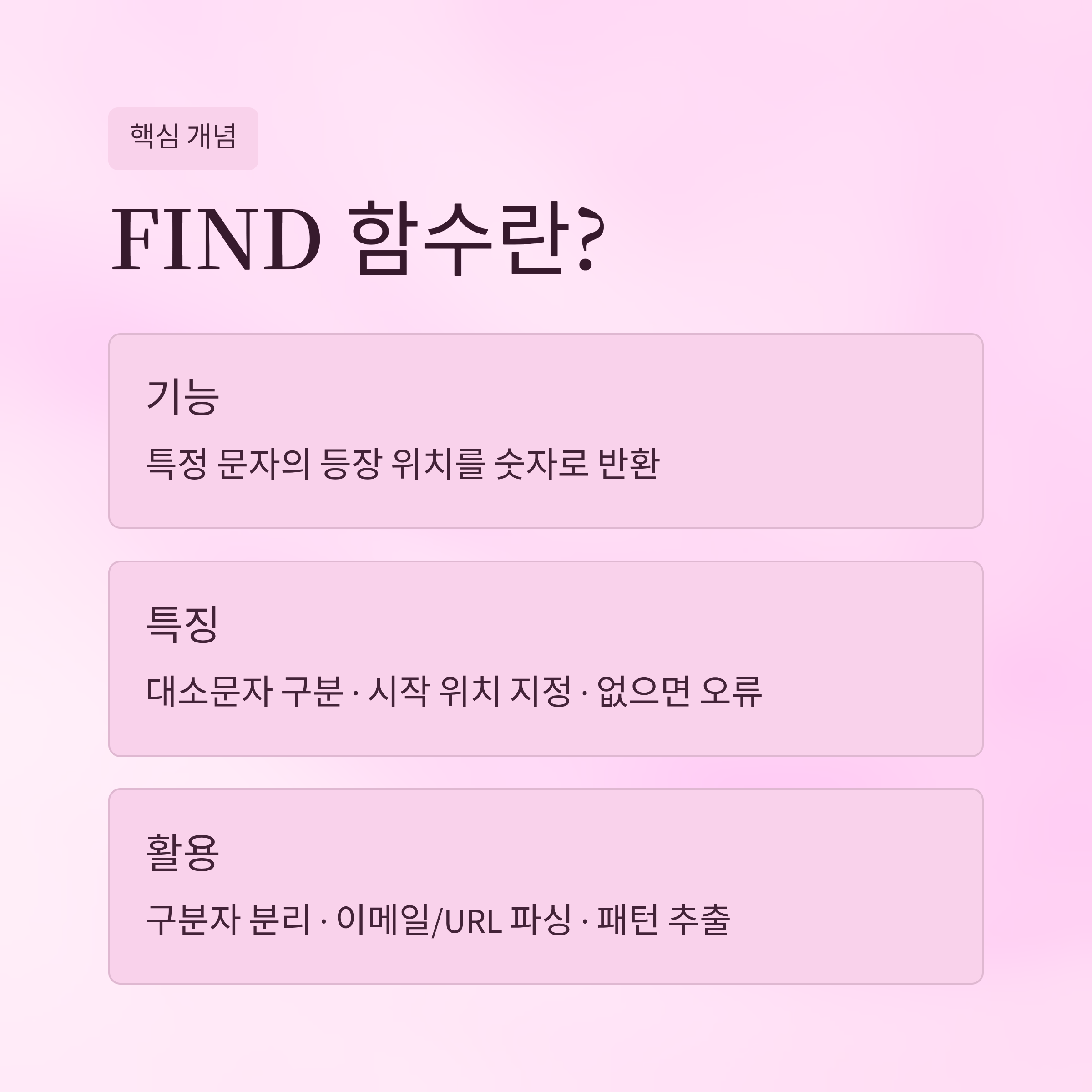 엑셀FIND함수는 특정 문자가 처음 등장하는 위치를 정확히 찾아서, 추출·분리 작업의 기준점을 만들어주는 함수예요.