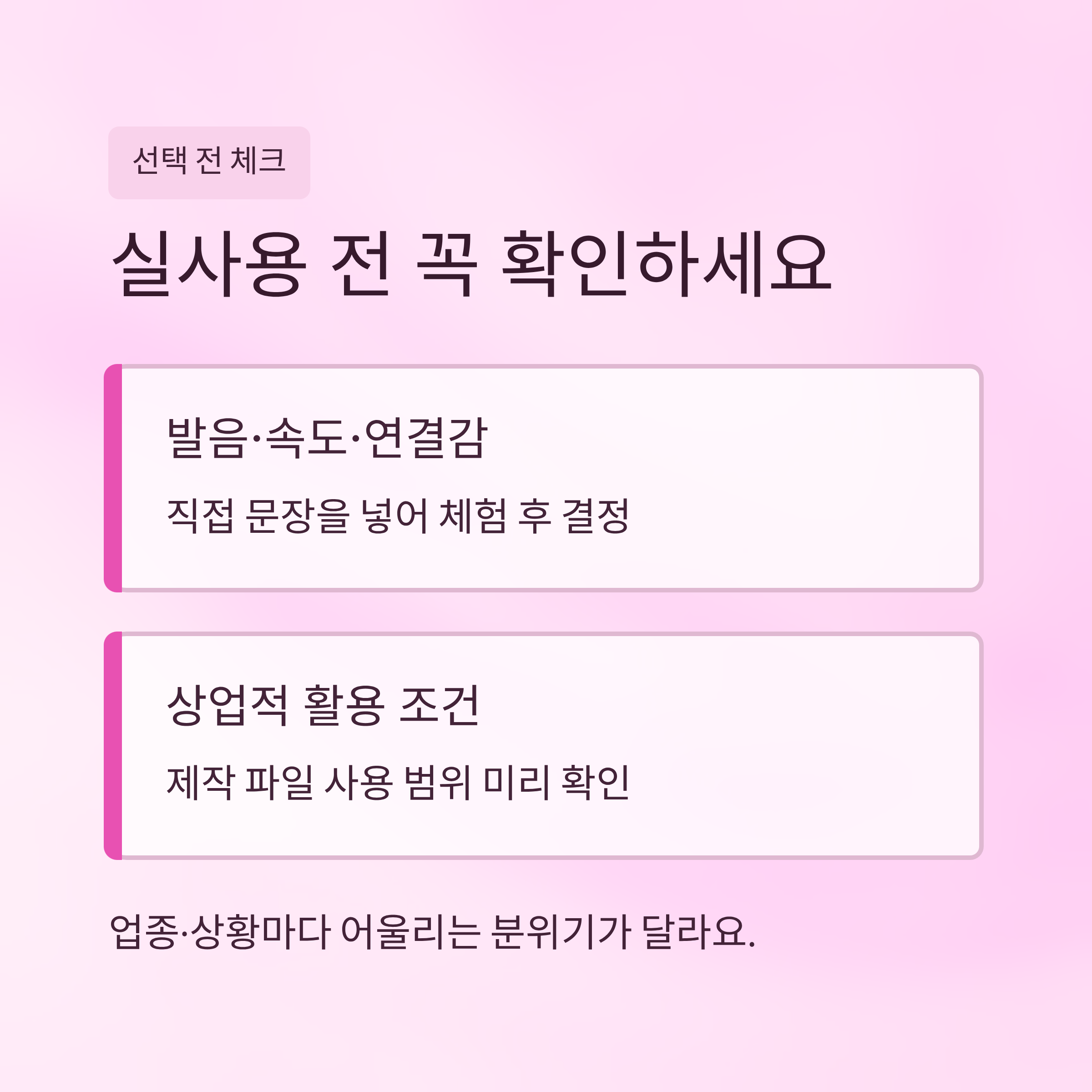 | 선택 기준 | 목소리 톤, 수정 편의성, 상업 활용 조건 |